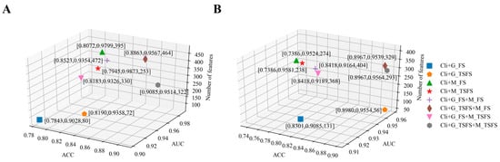 It should be noted in Figure 3A that, compared with the survival time prediction model built by ‘Cli+G_TSFS+M_FS’, although the AUC of the model built by ‘Cli+G_TSFS+M_TSFS’ is slightly lower at about 0.5%, the ACC is higher, at about 2%, and the number of features is greatly reduced. After comprehensive consideration, we employed ‘Cli+G_TSFS+M_TSFS’ to build the survival time prediction model. It should be noted in Figure 3B that, when building the vital status prediction models by ‘Cli+G_TSFS+M_TSFS’ and ‘Cli+G_TSFS’, the differences in the ACC and AUC between these two models were 0.1%. When the differences in both the ACC and AUC between two models are small, we prefer the model with a larger AUC. Consequently, we employed ‘Cli+G_TSFS+M_TSFS’ to build the vital status prediction model. Finally, for the survival time prediction model, we integrated 3 clinical, 69 gene, and 250 methylation features to build this model. For the vital status prediction model, we integrated 1 clinical, 55 gene, and 237 methylation features to build this model.