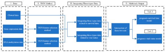 The research framework for the prognostic prediction in neuroblastoma is divided into 4 steps. I. Data. Clinical data and two types of omics data, gene expression and DNA methylation data, are used to predict composite clinical outcomes for neuroblastoma patients. II. TSFS method. The first step aims to select candidate features. The second step aims to remove the redundant features among them. III. Integrating three data types. The three selected types of data related to survival time and vital status are integrated by using the concatenation method. IV. Multi-task output. The intersection of two sets obtained in step III is used as the input of the multi-task learning method. Then, the results of two tasks are outputted simultaneously.