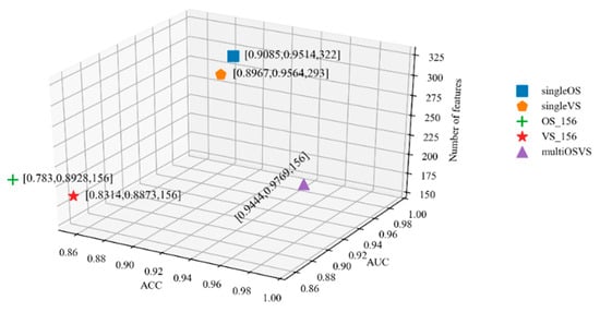 We employed the MMoE multi-task learning method to build the survival time and vital status prediction models simultaneously and jointly evaluated these two models by the absolute accuracy and AUC. The so-called absolute accuracy refers to the ratio of the number of patients whose predicted survival time and vital status labels are completely consistent with their true labels compared to the total number of patients. We randomly split the dataset into 80% for the training dataset and 20% for the testing dataset. We used five-fold cross validation in training data to obtain the optimal parameters of the MMoE model and tested this specific model in testing data. The experimental results of the survival time and vital status prediction models built by using single-task and multi-task learning methods are shown in Figure 5. As shown in the legend on the right of Figure 5, the five different models are presented by different markers. The meanings represented by ‘singleOS’, ‘singleVS’, and ‘multiOSVS’ are consistent with those in Table 3. In addition, ‘OS_156’ and ‘VS_156’ represent the survival time and vital status prediction models built by the features related to both the survival time and vital status, which are 1 clinical, 4 gene, and 141 DNA methylation features. There is a list of numbers next to each marker that sequentially represent the ACC, AUC, and the number of features of this specific model. For example, the list [0.9444, 0.9769, 156] shows that 0.9444 is the ACC of this model, 0.9769 is the AUC of this model, and 156 is number of features for building this model. In Figure 5, the closer the model is to the bottom right, the better the performance of the model. This signifies that the model has larger ACC and AUC values and fewer features compared with other models.