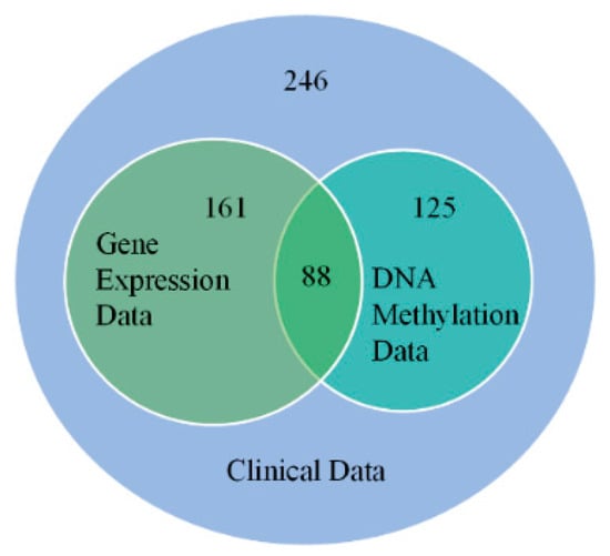 The neuroblastoma dataset contains clinical and various omics data from the TARGET database (Therapeutically Applicable Research To Generate Effective Treatments, see https://ocg.cancer.gov/programs/target (accessed on 9 November 2020)). In this study, we focused on integrating the clinical data and two types of omics data, i.e., the gene expression and DNA methylation data, to study the prognosis of neuroblastoma patients. We first downloaded these three types of data, as well as their ground-truth survival time and vital status contained in the clinical dataset. We used a Venn diagram to reveal the overlap between the three types of data, as shown in Figure 6. We only employed sample sets with clinical, gene expression, and DNA methylation data, leaving us with a total of 88 samples.