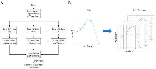 In this section, we will briefly introduce the maximal association coefficient (MAC) that was used to measure the association between two features. The association between them may be nonlinear, which can be partitioned into several piecewise-linear associations. This is a method to use a linear correlation coefficient to measure the nonlinear association between them. The piecewise-linear association can be achieved by a partitioning method. The schematic diagram of the MAC is shown in Figure 7A.