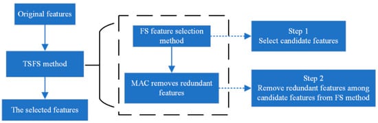 Considering that it is not only to quickly select candidate features for classifying but also to accurately remove the redundant features between them, we propose a novel two-step feature selection (TSFS) method in this section. The framework of the TSFS method is shown in Figure 8.