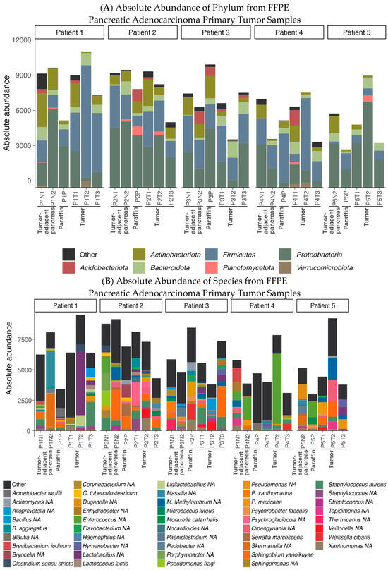 Absolute taxa bar plot in FFPE samples. (A) Phylum level representation. (B) Species level representation.