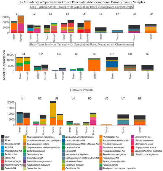 In frozen samples, gammaproteobacteria were present in 17/17 tumor samples and 9/9 tumor-adjacent normal samples from patients treated with neoadjuvant gemcitabine-based chemotherapy. They were present in 7/8 tumor samples and 4/5 tumor-adjacent normal samples from patients who did not receive neoadjuvant chemotherapy. The mean proportion of gammaproteobacteria within tumor samples of long-term survivors treated with neoadjuvant gemcitabine-based chemotherapy was 37% vs. 44% in short-term survivors treated with neoadjuvant gemcitabine-based chemotherapy (p = 0.3) and 44% in patients who had not received neoadjuvant chemotherapy. Although there was significant heterogeneity in gammaproteobacterial species between patients, pseudomonal species were the most commonly identified.