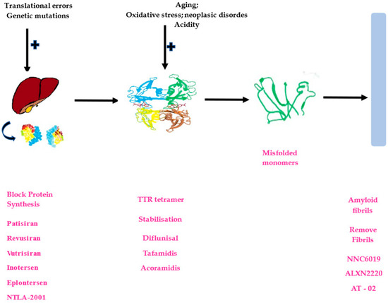 Transthyretin cardiac amyloidosis development. The development of this pathology can be induced by various factors. First of all, genetic mutations and translational errors lead to abnormal transthyretin protein synthesis. Further other factors such as aging, oxidative stress, neoplastic disorders, and acidity can destroy the normal configuration of TTR tetramer proteins with the formation of the misfolded monomers, leading to amyloid fibrils. Currently, several drugs have been developed with different actions, with some blocking hepatic transthyretin (TTR) synthesis (patisiran, revusinan, vutrisiran, inotersen, eplontersen, and NTLA-2001), others acting on TTR stabilization (difluninal, tafamidis, and acoramidis), and some trying to remove the amyloid fibrils (NNC6019, ALXN2220, and AT-02).