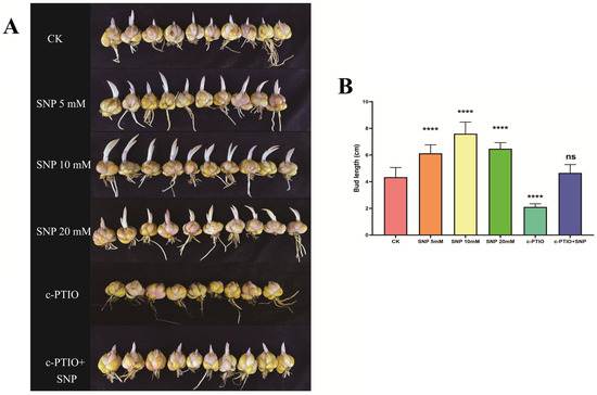 Figure 1. Lily bulblet dormancy release was affected by SNP and c-PTIO. (A) Phenotypes of bulblets treated with exogenous SNP (5 mM, 10 mM, and 20 mM) and c-PTIO (1 mM) for 3 h and grown at room temperature (4 °C) for 60 days. (B) Bulb length statistics. The data are shown as three independent biological replicates and three technical replicates (n = 3). ****—p ≤ 0.0001, ns—not significant.