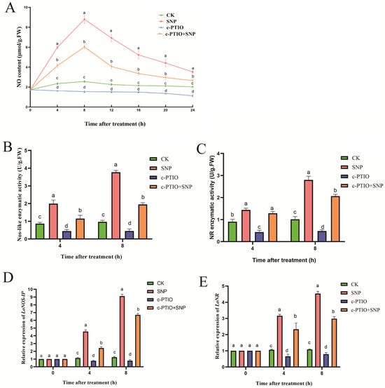 Figure 2. Effects of SNP and c-PTIO on NO contents (A), no enzyme activity (B,C), and NO-related genes expression (D,E). Values are means ± SDs (n = 3). The data are shown as three independent biological replicates and three technical replicates (n = 3). Different lowercase letters indicate statistically significant differences at p ≤ 0.05.