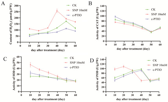 Figure 3. Changes in antioxidant enzyme activity (BD) and H2O2 contents (A) of lily bubs treated with 10 mM SNP, 1 mM c-PTIO or SNP with c-PTIO during dormancy release at room temperature (4 °C) for 60 days. The data are shown as three independent biological replicates and three technical replicates (n = 3).