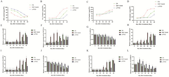 Figure 4. Changes in endogenous phytohormone contents and related genes expression of lily bubs treated with 10 mM SNP, 1 mM c-PTIO or SNP with c-PTIO during dormancy release at room temperature (4 °C) for 60 days. (A) ABA contents; (B) GA contents; (C) IAA contents; (D) ZR contents; (E) relative expression of LoARR; (F) relative expression of LoCYP707A1; (G) relative expression of LoDELLA; (H) relative expression of LoGA20x; (I) relative expression of LoGH3.1; (J) relative expression of LoNCED1; (K) relative expression of LoVIL1; (L) relative expression of LoXERICO. The data are shown as three independent biological replicates and three technical replicates (n = 3). Different lowercase letters indicate statistically significant differences at p ≤ 0.05.