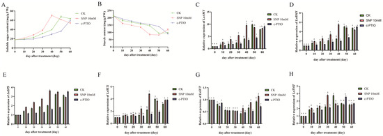 Figure 5. Changes in soluble sugar contents, starch contents, and related genes expression of lily bulbs treated with 10 mM SNP, 1 mM c-PTIO or SNP with c-PTIO during dormancy release at room temperature (4 °C) for 60 days. (A) Soluble sugar contents; (B) starch contents; (C) relative expression of LoAMY; (D) relative expression of LoBMY; (E) relative expression of LoSPS; (F) relative expression of LoSUS; (G) relative expression of LoSUT; (H) relative expression of LoTMT. The data are shown as three independent biological replicates and three technical replicates (n = 3). Different lowercase letters indicate statistically significant differences at p ≤ 0.05.