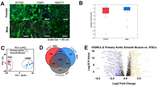 Generation of vascular smooth muscle cells (iVSMCs) from iPSC lines of both sexes. (A) Contractile markers (ACTA2, CNN1, and MHC11) were present in both male and female iVSMCs. (B) Contractile function, as measured by change in cell area after the addition of carbachol, for female and male iVSMCs. (C) Principal component analysis (PCA) of iVSMCs generated from 4 female and 4 male iPSC lines as compared to primary aortic smooth muscle cells. Unfilled symbols are male lines and filled symbols are female lines. (D) Venn diagram showing the number of proteins in which expression is shared by all 3 types of cells, between iVSMCs and iPSCs only, between iVSMCs and primary aortic smooth muscle cells only, or between iPSCs and primary aortic smooth muscle cells only. (E) Volcano plot of the log10 p-value of each expressed protein on vascular cell types (iVSMCs and primary aortic smooth muscle cells) vs. iPSCs. Only transcripts with a p-value of less than 0.05 were included, and those that did not demonstrate differential expression with a log2 fold-change in either direction greater than 0.5 are plotted in black. Negative values (blue) are higher in vascular smooth muscle cell types (iVSMCs and primary aortic smooth muscle cells) while positive values (orange) are higher in iPSCs.