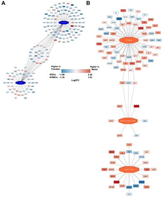 Differential expression of proteins by sex in iPSCs and iVSMCs demonstrated differences in functional pathways between the cell types. In female iPSCs, proteins related to mitochondrion and ATP binding were upregulated (A). Proteins related to ATP binding, glycogen metabolic process, and cadherin binding were upregulated in male iVSMCs (B). Red/orange correlates to proteins and pathways that are higher in males, and blue correlates to proteins and pathways that are higher in females. A larger version of this image is included in the supplemental material to ensure readability.