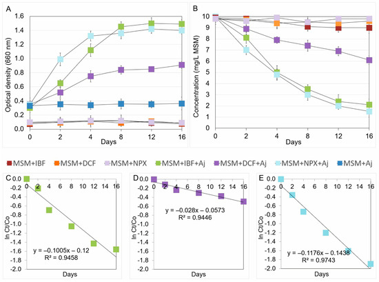 Data related to the growth rate of Acinetobacter johnsonii strain MC5 (A), concentrations of the analyzed NSAIDs (B), and the regression between ln(Ct/C0) of the chemical data and time (C–E) obtained for the experiment with liquid medium. The data presented are the means of three replicates with standard deviations. Aj: Acinetobacter johnsonii MC5; C0: concentration of NSAID at time zero; Ct: concentration of NSAID at time t; DCF: diclofenac; IBF: ibuprofen; ln: natural logarithm; MSM: mineral salt medium; and NPX: naproxen.