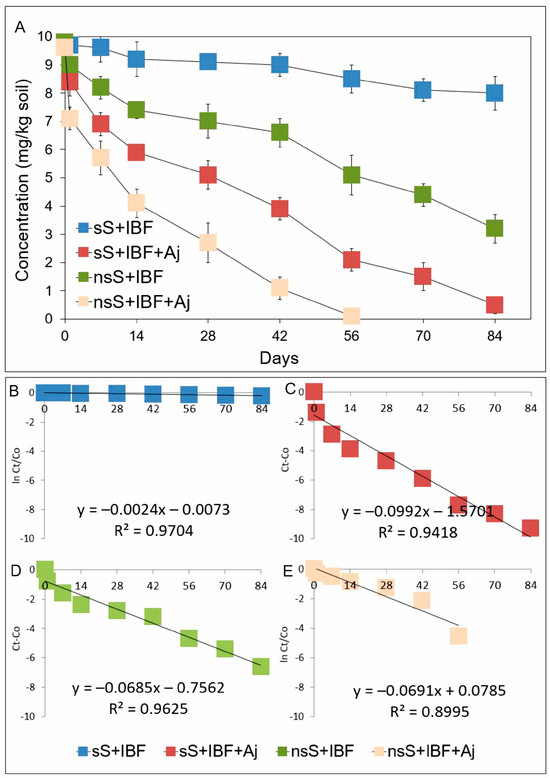 Data related to concentrations of ibuprofen (A) and the regression between ln(Ct/C0) and Ct − C0 of the chemical data and time (B–E) obtained for the experiment with soil. The data presented are the means of three replicates with standard deviations. Aj: Acinetobacter johnsonii strain MC5; C0: concentration of NSAID at time zero; Ct: concentration of NSAID at time t; IBF: ibuprofen; ln: natural logarithm; nsS: non-sterile soil; and sS: sterile soil.