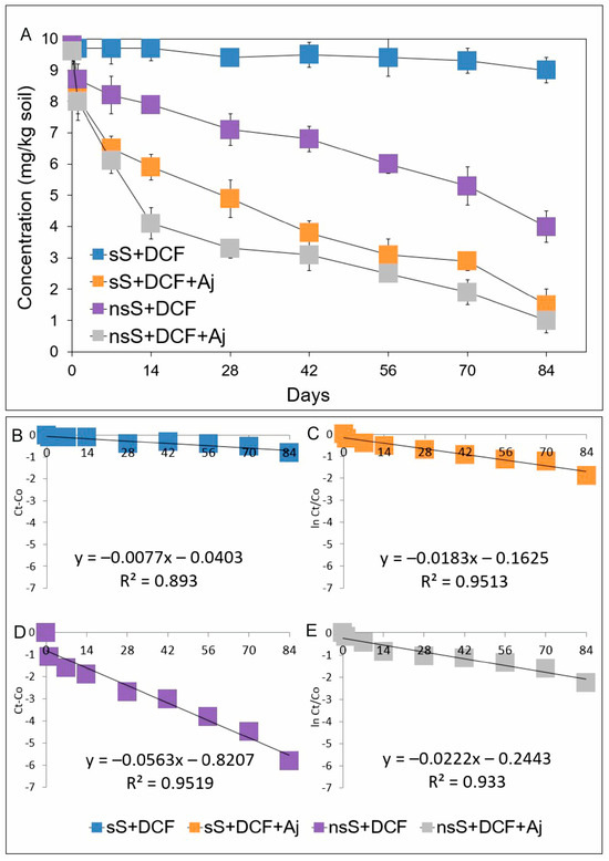 Data related to concentrations of diclofenac (A) and the regression between ln(Ct/C0) and Ct − C0 of the chemical data and time (B–E) obtained for the experiment with soil. The data presented are the means of three replicates with standard deviations. Aj: Acinetobacter johnsonii strain MC5; C0: concentration of NSAID at time zero; Ct: concentration of NSAID at time t; DCF: diclofenac; ln: natural logarithm; nsS: non-sterile soil; and sS: sterile soil.
