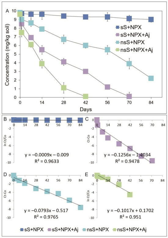 Data related to concentrations of naproxen (A) and the regression between ln(Ct/C0) and Ct − C0 of the chemical data and time (B–E) obtained for the experiment with soil. The data presented are the means of three replicates with standard deviations. Aj: Acinetobacter johnsonii strain MC5; C0: concentration of NSAID at time zero; Ct: concentration of NSAID at time t; ln: natural logarithm; NPX: naproxen; nsS: non-sterile soil; and sS: sterile soil.