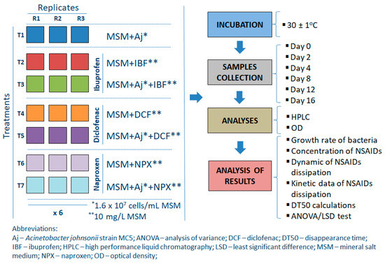Degradation studies were performed in 200 mL Erlenmeyer flasks containing 100 mL of sterile MSM containing the individual reference standards of NSAIDs as the sole carbon source and inoculated with bacterial strain (MSM+Aj+IBF, MSM+Aj+DCF, and MSM+Aj+NPX). Samples of MSM+Aj and MSM+IBF or DCF or NPX were used as controls. Drugs were added in such a quantity that their final concentrations in the medium were 10 mg/L. The bacterial suspension was introduced into the suitable MSM samples in order to produce a final bacterial count of approximately 1.6 × 107 cells/L MSM. A detailed description of the inoculum preparation for the experiment with MSM is provided in Appendix B. The experiment had a completely randomized block design and there were three replications of each treatment for each sampling time, which produced a total of 126 flasks in the experiment (i.e., seven treatments × three replications × six sampling times). Design and performed analyses for the experiment with MSM are shown in Figure 8, while a detailed description of the treatments used is provided in Appendix C.