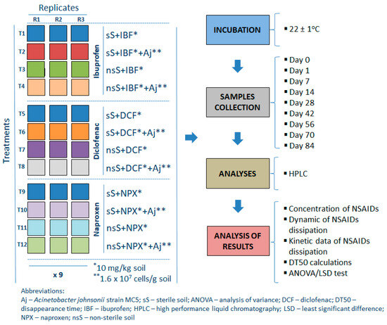 The water content of the soils was adjusted to 50% of the maximum water holding capacity and checked every week. Throughout the incubation period, water losses exceeding 5% of the initial values were compensated for by the addition of sterile deionized water. The pots with soil samples were covered with perforated polypropylene sheets and were incubated in the dark at 22 ± 1 °C for 84 days. Samples (three replicates for each treatment) were periodically removed (randomly) from the test system for chemical analyses to determine NSAID concentrations (on days 0, 1, 7, 14, 28, 42, 56, 72, and 84). Design and performed analyses for the experiment with soil are shown in Figure 9.