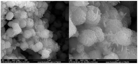 SEM micrographs reveal that the Zn2SnO4 particles exhibit a spherical morphology formed by the aggregation of nanorods, as depicted in Figure 2 at magnifications of 25,000× and 50,000×. These particles demonstrate a tendency to agglomerate and display dimensional uniformity, suggesting a high level of homogeneity in shape. Dimensional analysis was conducted for both spherical and rod-like morphologies, with average particle sizes of 1.17, 1.28, and 1.44 µm for spherical particles and 94.5, 114.68, and 106.48 nm for the nanorods. Following the SiO2 coating, a shell layer becomes visible on the surface of the particles, as shown in the micrographs in Figure 3. With the subsequent incorporation of 5-FU, the coating layer appears even more defined, as indicated in Figure 4. This suggests that 5-FU interacts with the silica shell, potentially forming a denser and more uniform layer around the particles. Notably, adding the silica shell and 5-FU does not significantly impact the size or morphology of the original Zn2SnO4 particles, indicating that the coating and drug incorporation processes preserve the physical dimensions and shape. Figure 5 illustrates the size distribution for both spherical particles and the nanorod-aggregated spheres.