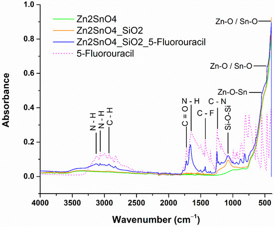 The FTIR analysis of the zinc stannate sample reveals a prominent vibrational band at 590 cm−1, which corresponds to the symmetric stretching vibration of ZnO and SnO2 groups, indicating the Zn–O–Sn bonding characteristic of Zn2SnO4. This absorption band strongly supports the successful formation of the zinc stannate compound, which is consistent with its expected properties. Additionally, wavenumbers at 463 cm−1 and 400 cm−1 are attributed to Zn–O and Sn–O chemical groups, respectively, confirming the synthesis of zinc stannate. These vibrational bands are consistently observed in all the synthesized samples, indicating that zinc stannate is the primary constituent in the formulations [36,37]. For Zn2SnO4@SiO2 and Zn2SnO4@SiO2@5-FU samples, a distinct vibrational band at 1072 cm−1 is observed, corresponding to the Si–O–Si functional group, which confirms the presence of the SiO2 coating layer. The incorporation of 5-FU in the Zn2SnO4@SiO2@5-FU structure is validated by several absorption bands in the FTIR spectra, consistent with the reference spectrum for 5-FU. Notably, N–H bending vibrations are detected at 3130 and 3067 cm−1, along with a similar bending band at 1600 cm−1, characteristic of the 5-FU compound. Additionally, C–H stretching appears at 2929 cm−1, while the C=O functional group is identified at 1772 cm−1. Strong evidence for 5-FU integration is further provided by the stretching vibration at 1430 cm−1, attributed to the fluoro compound C–F, and a band at 1240 cm−1 associated with the C–N functional group [38,39].
