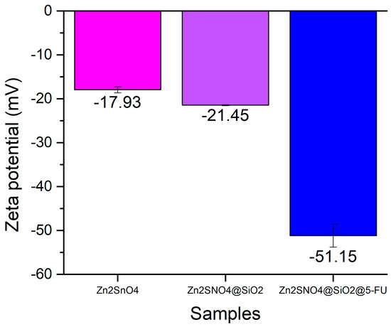 Zeta potential (mV) results of Zn2SnO4, Zn2SnO4@SiO2, and Zn2SnO4@SiO2@5-FU samples.