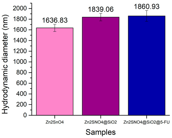 The hydrodynamic diameter measurements confirm that the particle size increased following the addition of both SiO2 and 5-FU, indicating successful coverage with the silica shell and the subsequent incorporation of the antitumoral and antibacterial agent. For the uncoated Zn2SnO4 nanoparticles, the hydrodynamic diameter was estimated to be 1636.83 nm. Upon coating with SiO2, the hydrodynamic diameter increased to approximately 1839.06 nm, demonstrating the successful formation of the silica layer around the Zn2SnO4 nanoparticles.