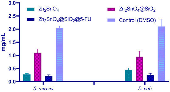 The minimum inhibitory concentration (MIC) of Zn2SnO4, Zn2SnO4@SiO2, and Zn2SnO4@SiO2@5-FU samples against S. aureus and E. coli.