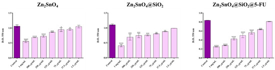 Furthermore, the cytotoxicity data were utilized to estimate the lethal dose 50 (LD50)—the concentration required to kill 50% of the cells exposed. The LD50 for Zn2SnO4 was 1 mg/mL, while the LD50 for Zn2SnO4@SiO2 could not be precisely determined but fell between 500 µg/mL and 1 mg/mL. In contrast, the LD50 for Zn2SnO4@SiO2@5-FU was 250 µg/mL, indicating a significantly higher cytotoxic potential for the 5-FU-incorporated sample due to the lower LD50 value.