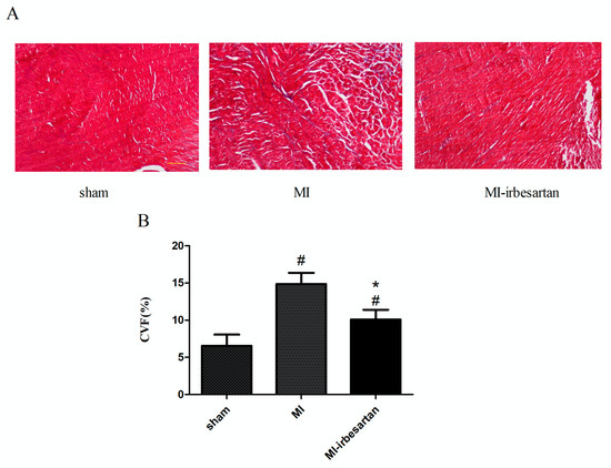Effects of irbesartan on cardiac fibrosis. (A) Masson trichrome staining for collagen (magnification: ×100). Red indicates cardiomyocyte, and blue indicates collagen. sham, sham-operated rats; MI, myocardial infarction rats; MI–irbesartan, myocardial infarction rats fed with irbesartan. (B) Graphical representation of collagen volume fraction in the sections. CVF, collagen volume fraction; the results are presented as mean ± SD. # p < 0.05 vs. sham-operated rats; * p < 0.05 vs. myocardial infarction rats.