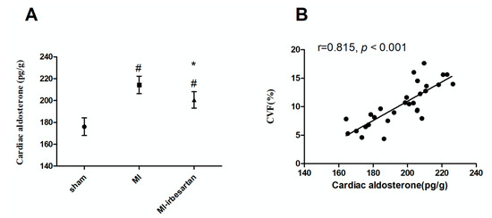 Effects of irbesartan on aldosterone levels in MI rats. The results are presented as mean ± SD. (A) Cardiac aldosterone levels. sham, sham-operated rats; MI, myocardial infarction rats; MI–irbesartan, myocardial infarction rats fed with irbesartan. # p < 0.05 vs. sham-operated rats; * p < 0.05 vs. myocardial infarction rats. (B) Correlation analysis between cardiac aldosterone and CVF. CVF, collagen volume fraction.