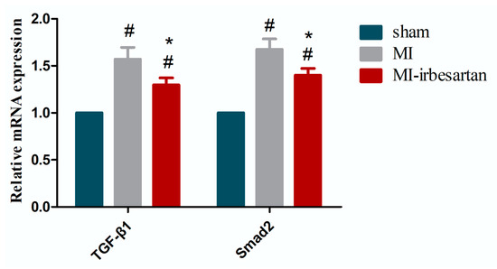 Effects of irbesartan on the mRNA expression of TGF-β1 and Smad 2. sham, sham-operated rats; MI, myocardial infarction rats; MI–irbesartan, myocardial infarction rats fed with irbesartan. The results are presented as mean ± SD. # p < 0.05 vs. sham-operated rats; * p < 0.05 vs. myocardial infarction rats.