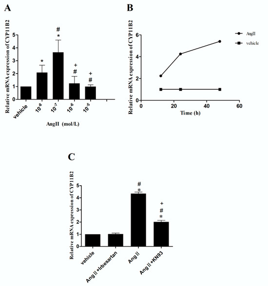 Effects of irbesartan on the CYP11B2 mRNA expression in CMECs. Five culture runs were performed for each group and three duplicates for every sample. (A) Effects of different concentrations of Ang II on CYP11B2 mRNA expression. * p < 0.05 vs. vehicle; # p < 0.05 vs. 10−8 mol/L Ang II; + p < 0.05 vs. 10−7 mol/L. (B) Ang II (10−7 mol/L) time-independently upregulated CYP11B2 mRNA expression. (C) Effects of different antagonists on Ang II-upregulated CYP11B2 mRNA expression. Ang II, 10−7 mol/L; irbesartan, 10−5 mol /L; KN93, 10−6 mol /L. * p < 0.05 vs. vehicle; # p < 0.05 vs. (Ang II + irbesartan); + p < 0.05 vs. Ang II.