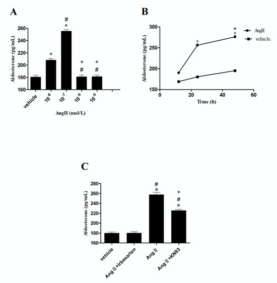Effects of irbesartan on aldosterone secretion in CMECs. (A) Effects of different concentrations of Ang II on aldosterone secretion. * p < 0.05 vs. vehicle; # p < 0.05 vs. 10−8 mol/L Ang II; + p < 0.05 vs. 10−7 mol/L. (B) Ang II (10−7 mol/L) time-independently increased aldosterone secretion. (C) Effects of different antagonists on Ang II-induced aldosterone secretion. Ang II, 10−7 mol/L; irbesartan, 10−5 mol /L; KN93, 10−6 mol/L. * p < 0.05 vs. vehicle; # p < 0.05 vs. (Ang II + irbesartan); + p < 0.05 vs. Ang II.