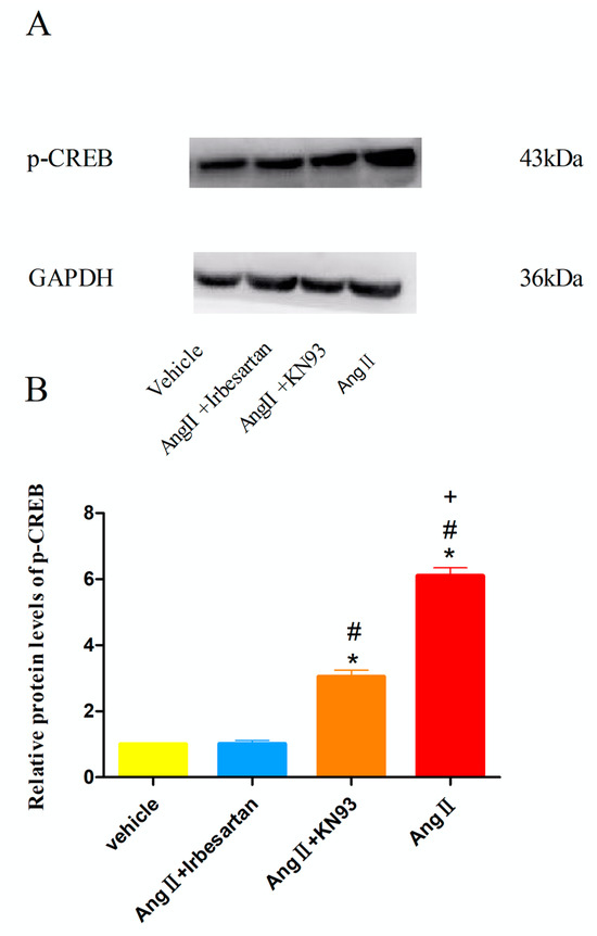As illustrated in Figure 6, the Ang II (10−7 mol/L)-treated group exhibited significantly elevated protein levels of the phosphorylated CREB (p-CREB) protein than that demonstrated by the vehicle group (p < 0.05). Notably, the protein levels of p-CREB in the irbesartan-treated group were similar to that of the vehicle group (p > 0.05), indicating that irbesartan effectively inhibited the Ang II-induced upregulation of p-CREB levels. Conversely, the administration of KN93 (10−6 mol/L) only partially blocked the Ang II-associated elevation in p-CREB levels (p < 0.05) (Figure 6).