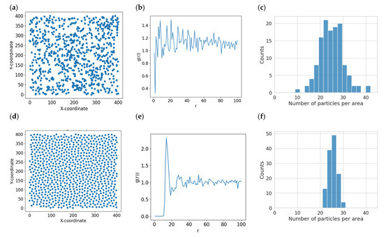 Modeling of a system of randomly arranged particles (a–c) and particles with repulsive potential (d–f). Two dimensional (2D) images (a,d); radial distribution functions (b,e); and density distribution (c,f) corresponding to the images, describing the location of the particles on the surface. LAMMPS was used for modeling single-type LJ particles with Coulomb repulsion in a 2D box with periodic boundary conditions.