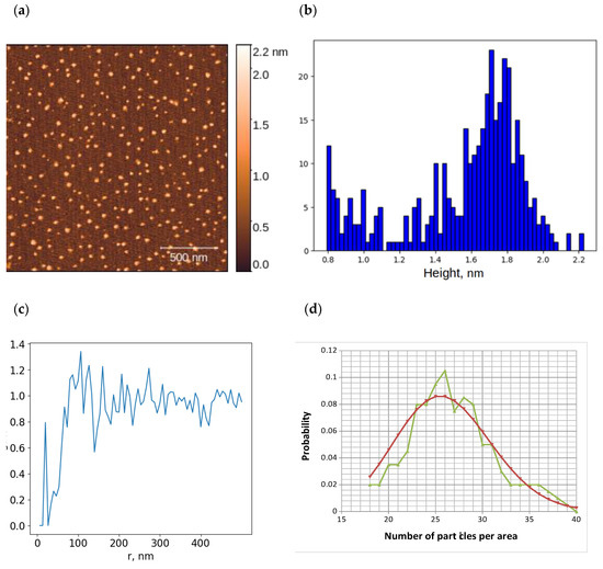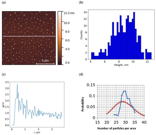 Results of AFM visualization of aurum nanoparticles (AuNPs) on the mica surface and data processing: typical AFM image of mica surface with adsorbed objects (a); histogram of height distribution of visualized objects on the surface (b); radial distribution function for objects on the surface (c); experimental distribution of AuNP (blue dots) and Poisson distribution with a mean value of 29 (red dots) (d).