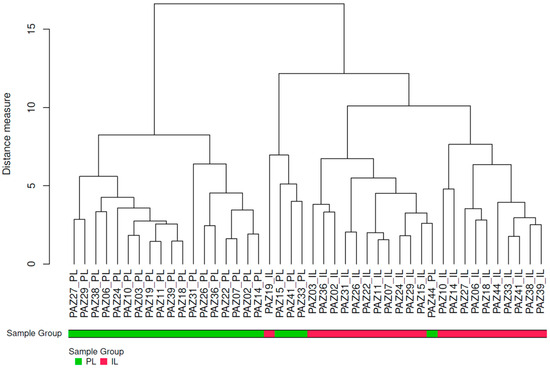 Dendrogram of hierarchical clustering of protein expression profiles from intra-lesional (IL) and peri-lesional (PL) biopsy samples using the complete protein data set. The dendrogram illustrates the clustering of all proteins extracted from PL and IL samples. The x-axis represents individual samples, while the y-axis indicates the distance measure used for clustering. PAZ = patient (identification code assigned to each patient).