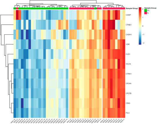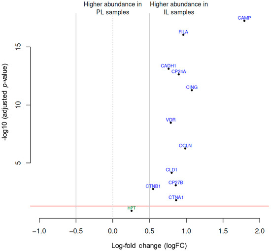 Analysis of protein expression revealed significant differences among several proteins in IL samples compared to PL samples (Figure 2, Table 2, and Supplementary Figure S2). CAMP revealed the highest log-fold change (logFC = 1.79) and an average expression (AveExp) of 12.82 (adjusted p-value = 5.5 × 10−18) (Table 2). Other proteins such as cingulin, (logFC = 1.08, AveExp = 10.11, adj.p = 5.3 × 10−12), occludin-1 (logFC = 0.99, AveExp = 10.48, adj.p = 5.5 × 10−7), and filaggrin (logFC = 0.96, AveExp = 10.46, adj.p = 8.9 × 10−17) also demonstrated marked (~2-fold increase) differences (Table 2).