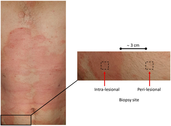At the initial visit, all AD patients underwent a single biopsy of a skin lesion (intra-lesional, IL) and another biopsy in the peri-lesional region (PL) approximately 3 cm from the margin of the lesion (Figure 4). After antiseptic preparation using povidone iodine, local anesthesia was administered with 2% mepivacaine. A tissue sample measuring up to 10 × 5 mm was excised. The biopsy site was then closed with 1–3 nylon (3.0) sutures, and a medicated bandage was applied. Patients were prescribed antibiotic prophylaxis consisting of 1 g amoxicillin combined with clavulanic acid taken every 12 h for five days. Sutures were removed between 7- and 15-days post-biopsy.