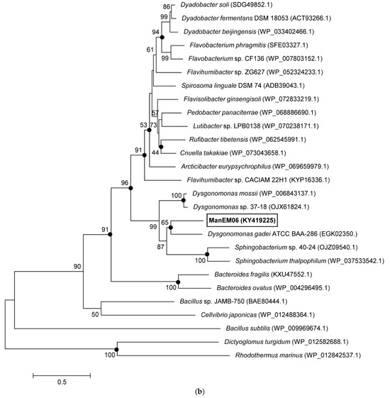 The sequence length of the putative β-mannanase (denoted ManEM6) was 1185 bp, encoding a peptide of 394 amino acids (45.2 kDa and pI 5.46) (Supplementary File S1). A scan of the deduced amino acid sequence using the SignalP3.0 database predicted a microbial signal peptide sequence in the N-terminal 20 amino acids, with its putative cleavage site between Ala20 and Ser21. BlastP homology search of ManEM6 showed the highest sequence identity (63%) with β-1,4-mannosidase from Dysgonomonas mossii. Further homologic comparison with the CAZy database (https://www.cazy.org/Glycoside-Hydrolases.html, accessed on 4 November 2024) revealed that ManEM6 may belong to GH26 [27]. The presumed 374-amino-acid sequence without the N-terminal signal peptide sequence (fragment of 1125 bp, 42.8 kDa, and pI 5.29) also contained the conserved GH26 domain. Conserved domain analysis with other β-mannanases showed that the deduced protein of ManEM6 contained three well-conserved motifs reported in the catalytic active site of GH26. The deduced protein of ManEM6 contained an acid/base-donor site (Glu189) [28], a catalytic nucleophile active site (Glu296) [29], and a putative catalytic residue (Asp254) [30], indicating inherent β-mannanase activity in ManEM6 (Figure 1a).