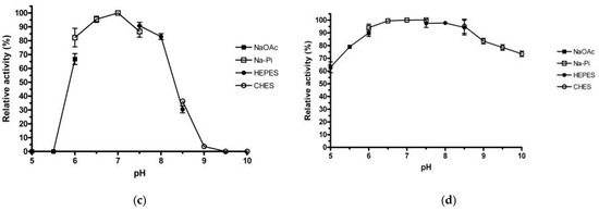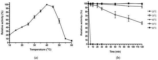 SDS–PAGE analysis showed a homogeneous band of 43 kDa, which was consistent with the estimated molecular weight (Figure 2). Zymographic staining of the purified rManEM6 on polyacrylamide gels revealed the active band of mannanase at a position corresponding to the molecular mass of the protein on SDS–PAGE. The enzymatic characteristics of rManEM6 were monitored using locust bean gum galactomannan, and it showed maximum hydrolytic activity at 40 °C and pH 7.0. Interestingly, rManEM6 showed relatively high activity and stability at low temperatures, retaining 70, 40, and 20% of its maximum activity at 30, 20, and 10 °C, respectively. rManEM6 stably maintained more than 90% activity below 40 °C, whereas it quickly lost its glycosyl hydrolase activity at temperatures higher than 50 °C. The stable half-life of rManEM6 was 2 h at 50 °C; it was most active in a pH range of 6.0 to 8.0. Meanwhile, pre-exposure of rManEM6 to acidic and alkaline conditions did not significantly affect its enzymatic activity; even after long-term pre-incubation in acidic or alkaline pH for 15 h at 4 °C, rManEM6 maintained stable activity over pH 5.0–10.0, with at least 70% residual activity retained (Figure 3).