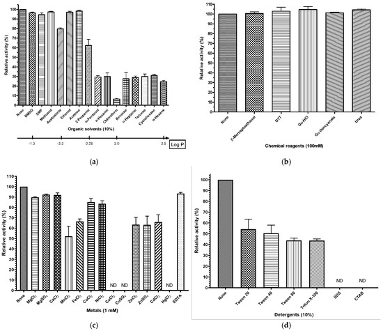 Enzymatic stability of rManEM6 against enzyme inhibitors. (a) The same amount of rManEM6 protein (0.2 μg) was pre-incubated at 30 °C for 30 min with different organic solvents (10% [v/v]) in 50 mM sodium phosphate buffer (pH 7.0, 200 μL), and residual β-mannanase activity was measured at 40 °C for 10 min with locust bean gum (0.5%, [w/v]) as a substrate. The bar represents the log-polarity of each organic solvent. DMSO, dimethyl sulfoxide; DMF, dimethylformamide. (b) To determine stability under chemical reagents, rManEM6 (0.2 μg protein) was pre-incubated with various denaturants or reducing agents at 30 °C for 30 min, and residual activity was measured. Gu-HCl, guanidine hydrochloride; gu-thiocyanate, guanidine thiocyanate. (c) An enzyme assay was performed after pre-incubation of rManEM6 with 1 mM of each of the indicated metal ions at 30 °C for 30 min. The relative amount of mannose produced was compared with that in the standard reaction. (d) To examine the effects of detergents on rManEM6 stability, the residual activity from pre-incubated enzyme (in 10% ([v/v] or [v/w]) detergent at 30 °C for 30 min) was measured. SDS, sodium dodecyl sulfate; CTAB, cetyltrimethylammonium bromide. The activity measured in the absence of any of the chemical compounds is shown as 100% (p ≤ 0.01). ND, not detectable.