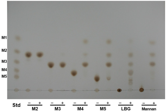 Thin layer chromatography analysis of hydrolysis products of mannose oligo- and polysaccharides by rManEM6. Enzymatic hydrolysis of each substrate (0.5%, w/v) was performed either with (+lanes) or without (–lanes) ManEM6 in 50 mM sodium phosphate buffer (pH 7.0) at 40 °C for 12 h. Lane Std, mannooligosaccharide standards: mannose (M1), mannobiose (M2), mannotriose (M3), mannotetraose (M4), and mannopentaose (M5).