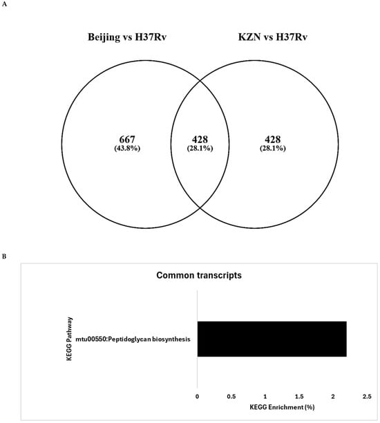 The observation of a greater number of SDETs in the Beijing strain compared to the laboratory H37Rv, might suggest a more complex and adaptive transcriptional responses in this strain compared to the KZN strain. Previous studies revealed a hypervirulent phenotype of the Beijing strain on in vitro [] and in vivo infection models [,], which is characterized by low cytokine responses [,]. Additionally, its global prevalence is associated with high transmissibility [,] compared to other clinical strains. Hence, transcriptional plasticity rendered by high SDETs identified in the current study might be advantageous to this clinical strain. The current study also revealed that the Beijing strain uniquely upregulated transcripts involved in the Tuberculosis KEGG pathway, which include pathogen- and host-specific transcripts that play critical roles in pathogenesis, while the KZN strain upregulated transcripts were involved in fatty acid and steroid degradation KEGG pathways. The presence of uniquely enriched KEGG pathways in the KZN strain suggests that despite its lower number of SDETss compared to the Beijing strain, it may possess distinct mechanisms that contribute to its persistence and virulence in specific populations, and this remains to be investigated in genetically diverse strains and infected individuals. The uniqueness of the KEGG pathways induced by these clinical strains could reflect strain-specific adaptations that confer advantages in particular environments or host interactions. It has been established that these strains induce unique immune responses [,,,]. Hence, their ability to activate unique transcriptional pathways is necessary for their specific phenotype and behavior. Furthermore, it was not surprising that common transcripts and those unique for each strain all enriched the peptidoglycan biosynthesis pathway. This pathway is essential for structural support, cellular processes, and virulence; hence, its enrichment is crucial in all M. tuberculosis strains [,].