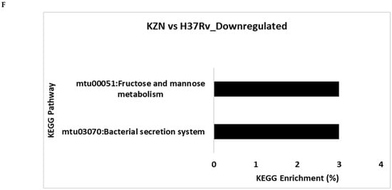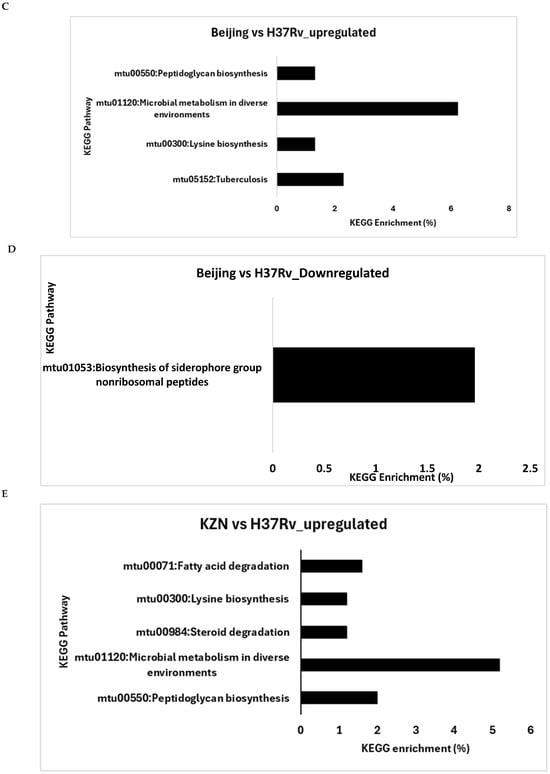 DeSeq2 analysis revealed a total of 856 and 1095 significantly differentially expressed transcripts (SDETs) between the KZN and Beijing strains, compared to the laboratory H37Rv, respectively, from the Total RNA Seq reads. The Beijing vs. H37Rv strains exhibited the highest number of both up (630) and downregulated (465) transcripts compared to KZN vs. H37Rv up (518) and downregulated (338) transcripts in Total RNA Seq reads. This was comparable to the high SDETs in smRNA Seq outputs with a total of 423 and 524 transcripts in KZN vs. H37Rv and Beijing vs. H37Rv, respectively, for both annotated and unannotated transcripts. DeSeq2 analysis revealed the presence of well-annotated transcripts in these clinical strains as well as unknown transcripts that varied among the clinical strains compared to the H37Rv strain (Table 1). Furthermore, the SDETs were intersected through a Venn diagram (Figure 1A), and 428 transcripts were common to both strains vs. H37Rv, while 428 and 667 transcripts were exclusively differentially regulated by the KZN vs. H37Rv and Beijing vs. H37Rv, respectively. The up- and down-regulated SDETs among the strains enriched various KEGG pathways as shown in Figure 1B–F. The peptidoglycan biosynthesis KEGG pathway was enriched in the common transcripts as well as in the upregulated transcripts for both the Beijing and KZN strains, versus the laboratory, H37Rv strain. Furthermore, the upregulated transcripts for both strains enriched the Microbial metabolism in diverse environments and lysine degradation KEGG pathways. Other KEGG pathways for the down-regulated transcripts were unique as shown in Figure 1D,F.