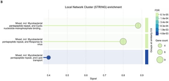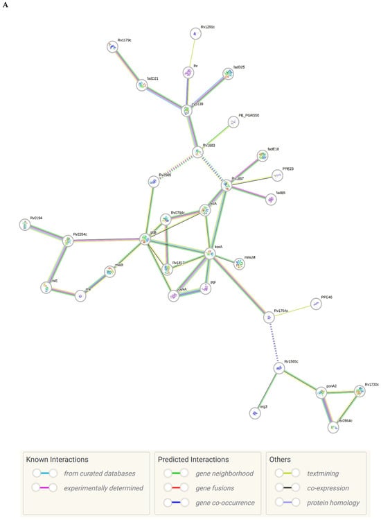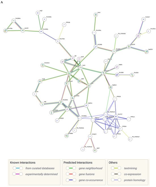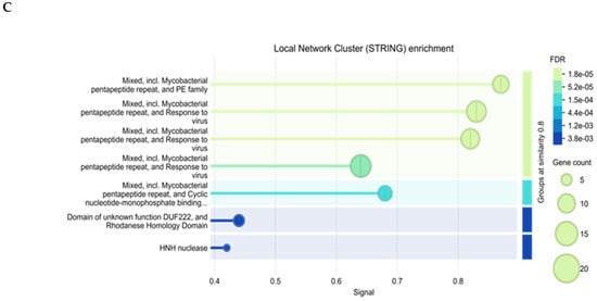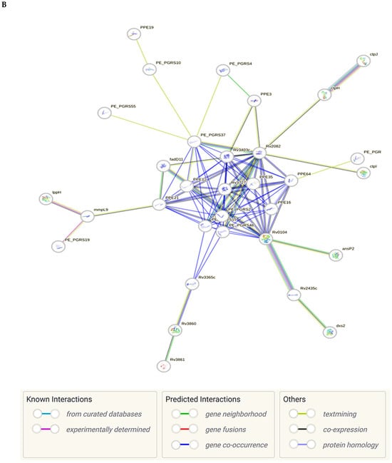 (A) Protein–protein network interactions for 33 out of 130 mRNA targets; and (B) 32 out of 130 mRNA targets for Transcript 354, respectively. These identified interactions included known interactions, predicted interactions as well as others from the annotated M. tuberculosis genome. (C) Functional Enrichment analysis of both protein networks revealed diverse functional categories, including mixed Mycobacterial pentapeptide repeats and PE family, Rhodanese homology domain, as well as the HNH nuclease. The 130 mRNA targets for Transcript 354 were used to generate the protein network and functional enrichment within the Search Tool for Retrieval of Interacting Genes/Proteins (STRING) database. FDR: False Discovery Rate.