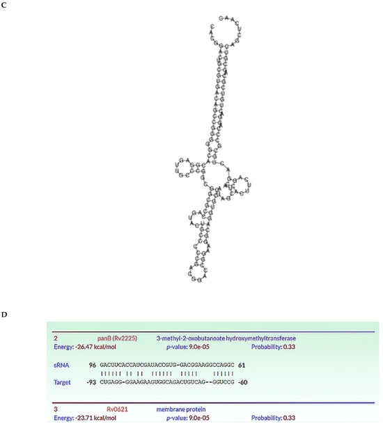 The discovery of regulatory noncoding sRNAs in M. tuberculosis in the late 2000s has provided insight into gene regulation and changes in molecular mechanisms in response to external stimuli [,]. The Mcr7 was one of the first sRNAs to be classified in M. tuberculosis. This transcript forms part of the PhoPR two-component system, which is essential for virulence in M. tuberculosis. Secretory proteins of the Twin Arginine Translocation protein secretion complex that is modulated by tatC mRNA are significantly reduced in the presence of Mcr7, indicating the critical role of this sRNA within this complex []. The expression of the Mycobacterium tuberculosis complex (MTBC) exclusive MTS1338 sRNA has been identified to facilitate adaptation and survival of the bacterium within the low pH conditions in the macrophage environment. Furthermore, MTS1338 overexpression triggered numerous transcriptome changes, such as the reduction in the translational activity and decreased growth, indicative of the bacterium transitioning to a dormant state []. The mycobacterial regulatory sRNA in iron (Mrsl) directly binds to the target, bfrA, a response activated during iron-limiting conditions resulting in iron-sparing, thus allowing for the survival of the Mycobacterium. This is activated as an anticipatory response toward iron deprivation that is typical within a macrophage environment []. These are just a few of the small transcripts identified in MTBC, which mainly target several mRNAs, in an antisense manner, and are activated as a stress, virulence, pathogenicity, and adaptive response [,]. The majority of the over 200 sRNAs identified within the MTBC, were predicted through in silico tools, while few have been confirmed and functionally characterized [].