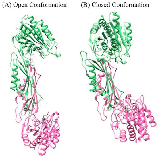 (A) Open conformation of NmDapE enzyme (PDB 5UEJ) [12]. (B) Closed conformation of HiDapE (PDB 5VO3) [11]. Subunit A is in light green and subunit B is in pink.