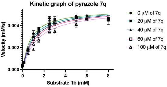 We performed kinetic competition assays to investigate and confirm the binding mode of the pyrazole inhibitors. For these studies, we employed one of the most potent pyrazole analogs, single enantiomer 7q. The velocity of the HiDapE enzyme was measured with different concentrations of substrate from 0 to 100 μM, and the plot is shown in Figure 2. After running the AICc statistical analysis [20,21] to compare noncompetitive and competitive models, it was determined that a competitive binding mode is over 100 times more likely than noncompetitive binding with a 99.2% probability.