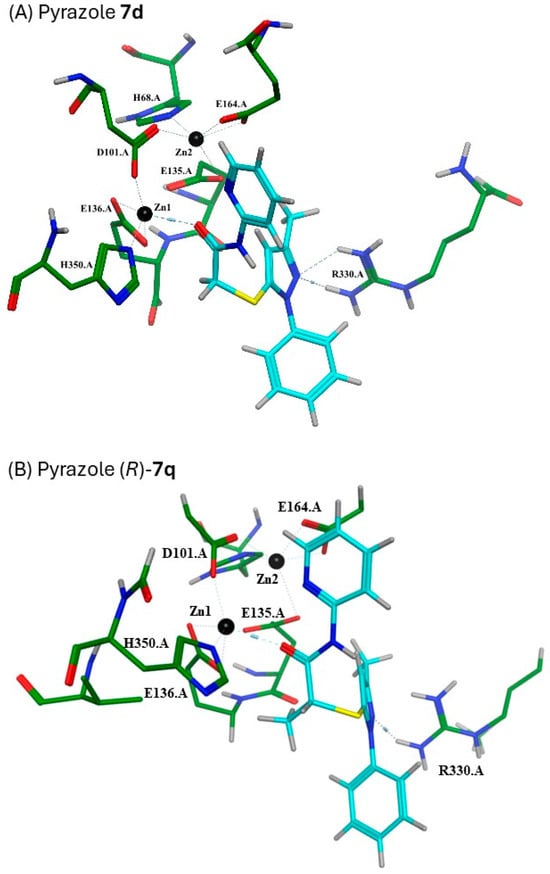 Docking Protocol: Molecular models of pyrazole analogs 7d, 7q, and 7r were built using the Molecular Operating Environment (MOE, Version 2024.06) computational suite [42]. The ligands were protonated at 310 K, pH 7.4 and a salt value of 0.1, followed by energy minimization in the gas phase using the MMFF94x force field [43]. A database file of each ligand was generated following initial preparation. Further optimization of the ligands were performed using the MOE’s database wash utility with enumerate protonation at pH 7.4 with a limit of 10. The X-ray crystal structure of NmDapE (PDB 5UEJ), which was already optimized and protonated at 310 K, pH 7.4, and a salt value of 0.1 using Protonate3D, was then uploaded into MOE and prepared for docking using MOE’s Structure Preparation utility. The active site of chains A and B, which includes the dinuclear Zn(II) center, was surveyed using MOE’s Site Finder utility and populated with inactivated dummy atoms to define the docking location. Following preparation of the ligands and the NmDapE docking receptor model, induced-fit molecular docking using the previously generated ligand conformation database was carried out with the solvent atoms inactivated at the docking site specified by the dummy atoms populating the substrate-binding cleft of chain A and B of the docking receptor. The alpha triangle placement method with affinity dG scoring generated 1000 poses, which were further refined using the induced fit method with GBVI/WSA dG scoring to obtain the top 100 poses. The Amber14:EHT [44] force field was used to perform these calculations. We were able to run docking experiments with NmDapE rather than HiDapE, which was used for the assay, because the sequence homology of NmDapE and HiDape is >99.99%.
